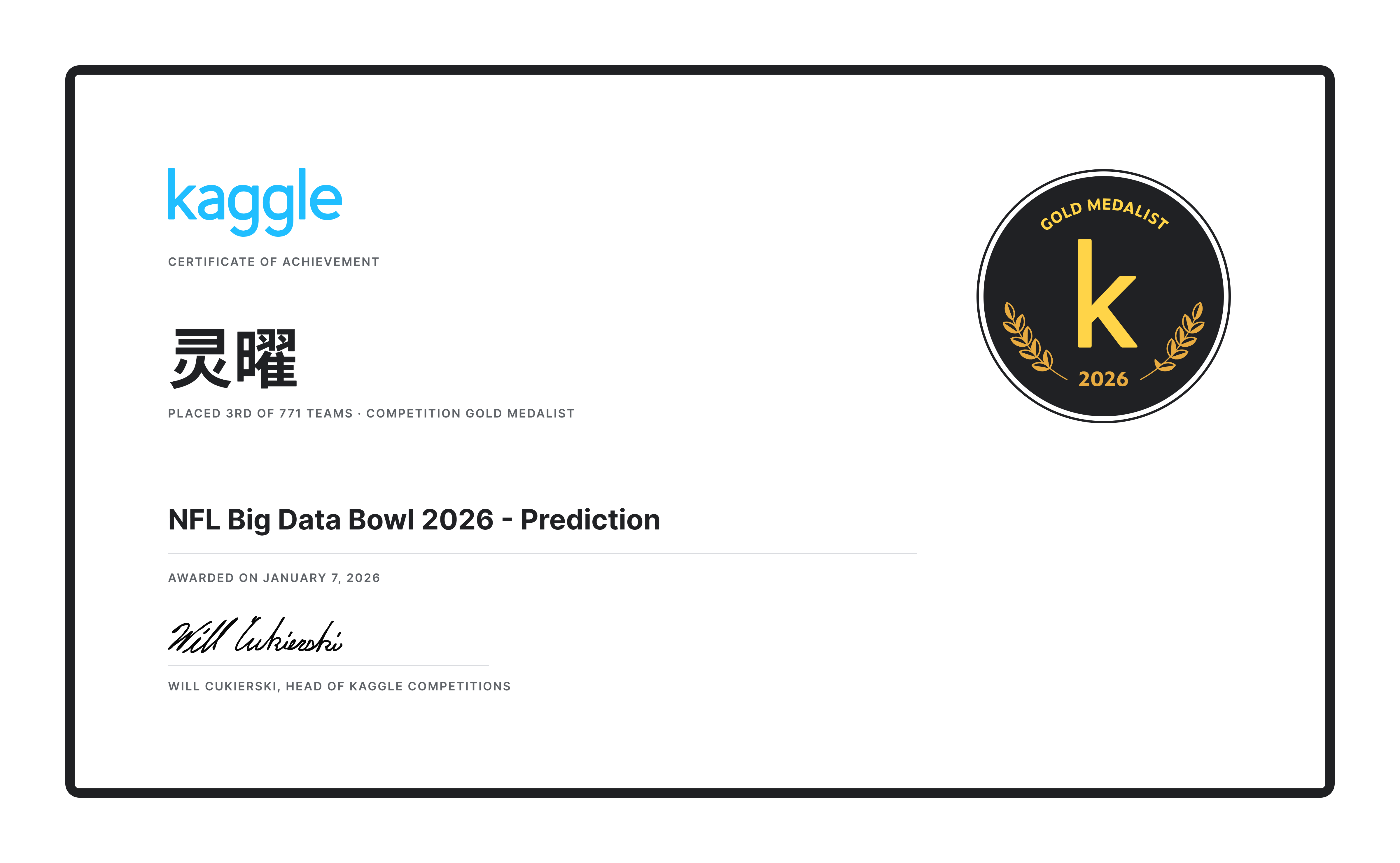 Kaggle 2026 NFL Big Data Bowl 2026 - Prediction [link] [certificate]🏅 Gold Medal.