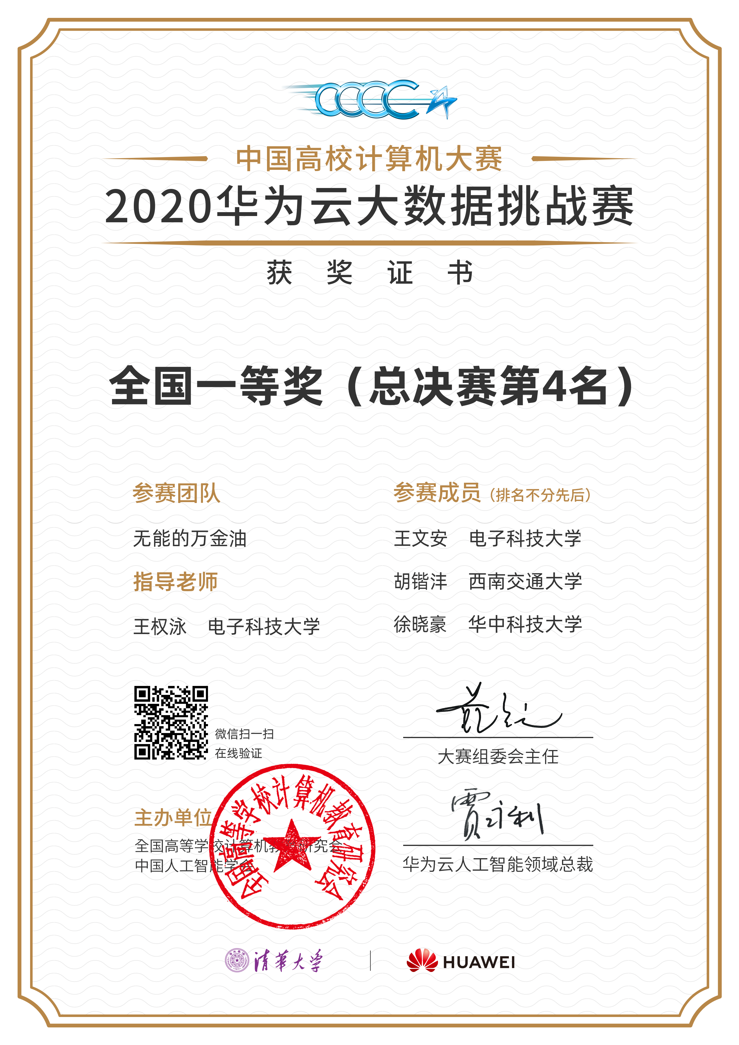 C4 2020: China Collegiate Computing Contes 2020 - Huawei Cloud Big Data Challenge 4/1491 [link], 🏆 First Prize [certificate].